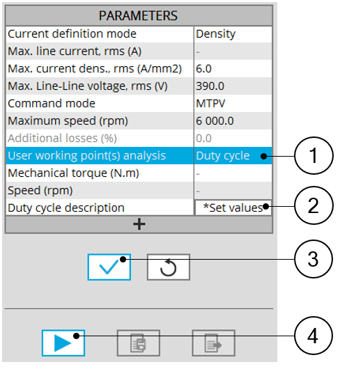 This duty cycle must be defined by using the next field: "Duty cycle description" and by clicking on the button "Set values".