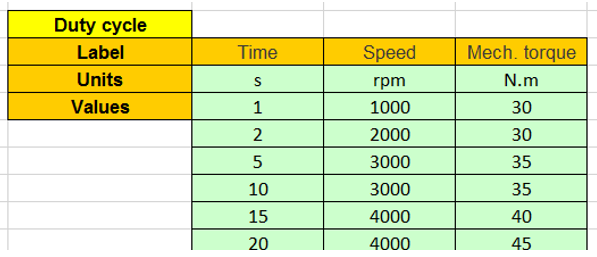 Two ways are possible to fill in the table: either filling the table line by line or by importing an excel file in which all the working point of the duty cycle are defined.