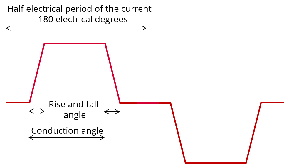 The “ Conduction angle ” ( Electrical conduction angle ) is the time during which phase is powered with current.