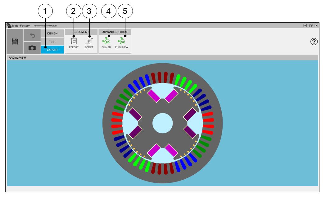 In “ADVANCED TOOLS”, the functions “FLUX 2D” and FLUX SKEW allow to build and export a model in Altair® Flux® environment (2D, or Skew) for performing advanced studies either with magneto static or transient applications.