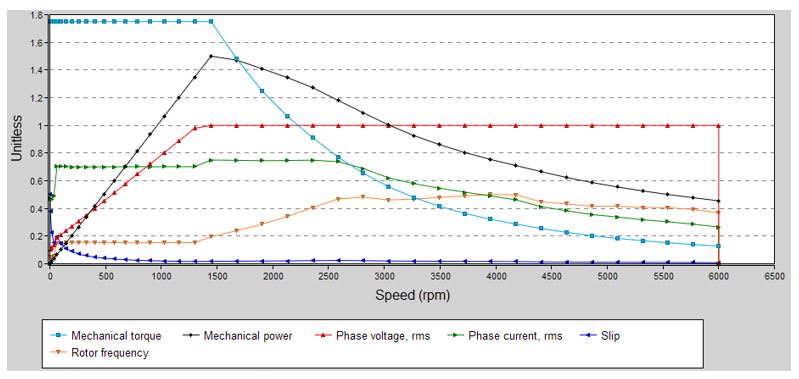The four main user input parameters are “the maximum Line-Line voltage, the rated power supply frequency, the maximum line current and the maximum speed”. In addition, temperatures of winding, and squirrel cage must be set, and the power electronics data if needed.