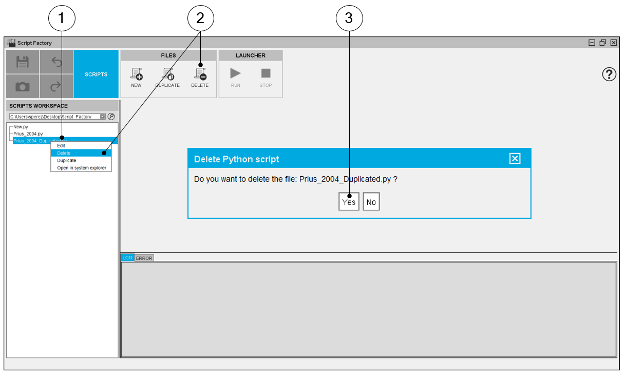 In Script Factory application, a selected python file from the workspace tree can be deleted.