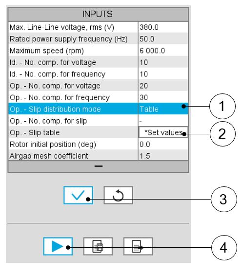 The number of computations for the slip must be defined with the user input « Op. - No. comp. for slip » (Operation of model to generate T(U,f,s) - Number of computations for slip).