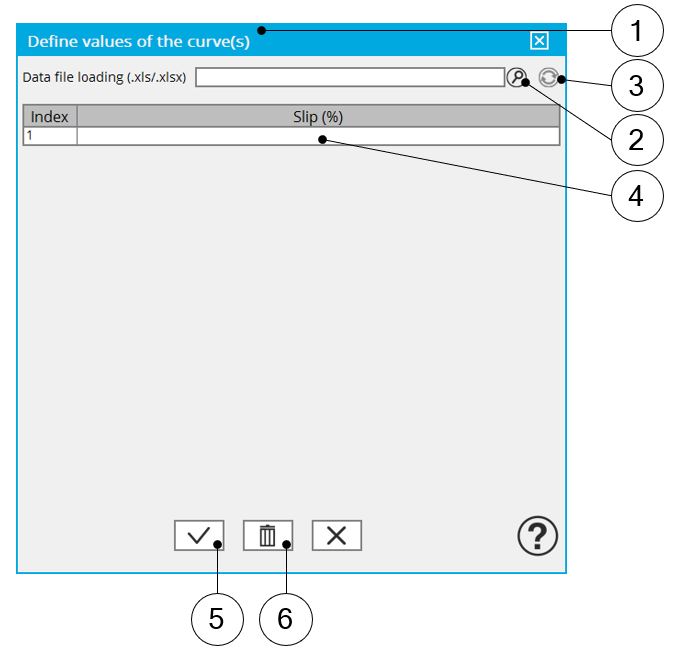 When the choice of point distribution mode is “Table”, the list of slips to be considered “Op. - Slip table” (Operation of model to generate T(U,f,s) - Slip table) must be provided. Refer to the above section 2) Slip distribution mode = Table