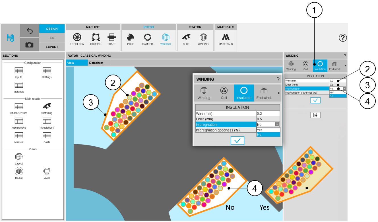 1 | Insulation settings allow the user to describe the coil insulation (wire, liner, impregnation) and how to fill the slot. |