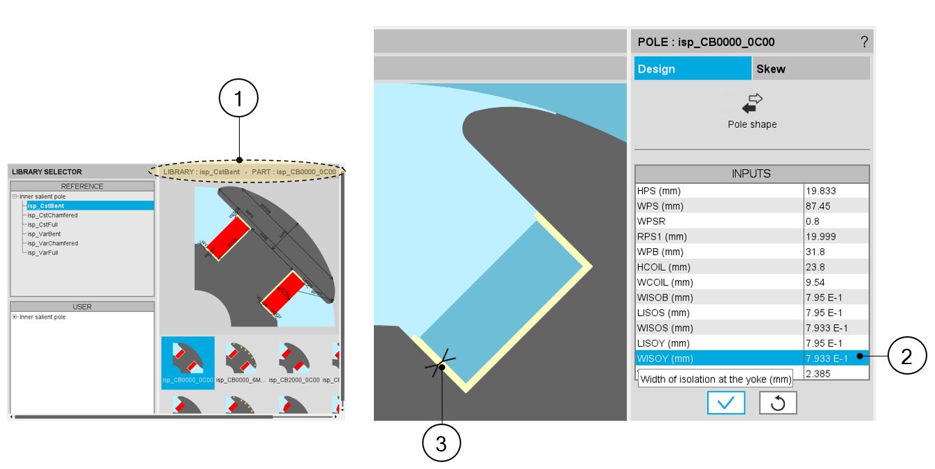 The parameters, such as WISOY allow adjusting the isolation thickness of the winding on the yoke side. Use WISOB and WISOS to adjust the isolation thickness on the pole body and pole shoe sides. |