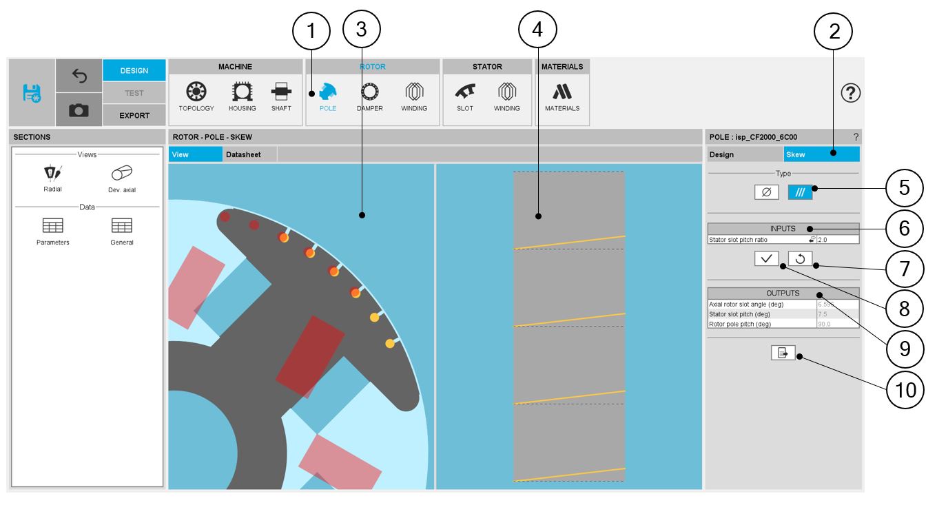 2 | The Skew tab indicates the tool to define the pole skew angle |