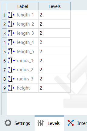 In this step you will set up a Fractional Factorial DOE with Resolution IV. Using the nine input variables with two levels, without turning on any interaction, leads to a 24 run Fractional Factorial plan.