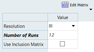 In this step you will set up a Fractional Factorial DOE, with resolution III and the same levels as the previous Full Factorial DOE.