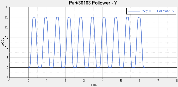 In some cases, the dynamics of the system may cause the follower to lose contact with the cam. This is called ‘lift-off’. In such cases, modeling the system with a PTCV will give you incorrect results because the joint constrains the follower point to always be on the curve (and hence cannot model lift-offs). For such cases, you must use contact modeling (refer to MV-1010: 3D Mesh to Mesh Contact Simulation). However, you will want to start with a PTCV model since it is a lot easier than modeling contact. Given this scenario, model the system using a PTCV joint and monitor the PTCV joint reaction. If the reaction on the follower is a ‘pulling’ reaction, this indicates lift-off would have occurred and you must switch to a contact model. Otherwise, the contact model is unnecessary. Now, you will check the model you used in the tutorial. The follower is moving along the Y-axis, so any negative reaction along the Y-axis is a 'pulling' reaction.