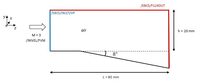 The Prandtl-Meyer expansion fan is a classic example of incompressible fluid mechanics. It involves a supersonic flow propagating along with a convex corner. As the flow turns around the corner, it gradually loses pressure and accelerates. This process is considered isentropic and happens through an infinity of small steps forming a visible fan. The numerical results obtained for the thermodynamics variables in each state can be compared to analytical values obtained using compressible fluid mechanics theory.