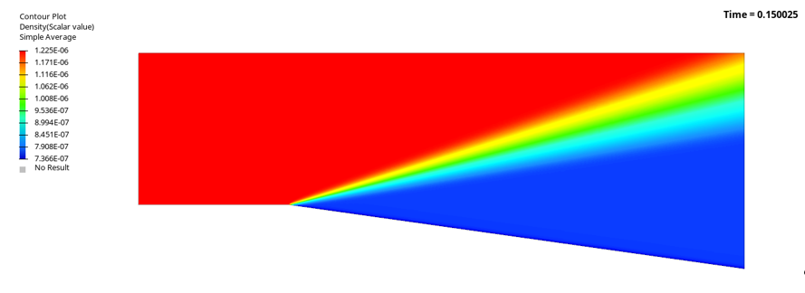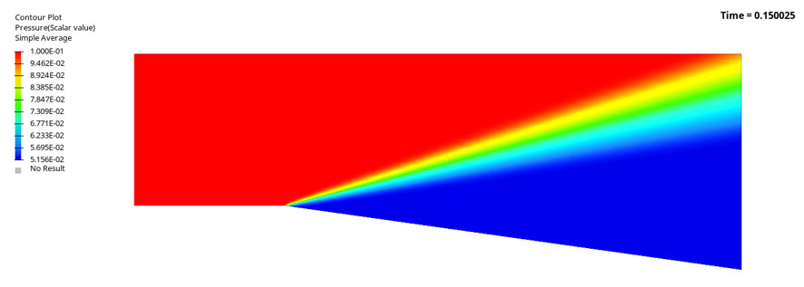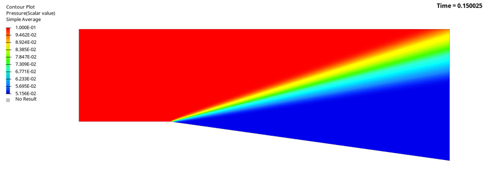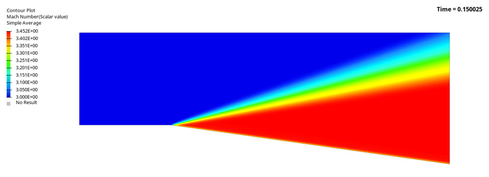 Supersonic flow is modeled using a /MAT/LAW6 hydrodynamic fluid law with an ideal gas equation of state (/EOS/IDEAL-GAS). This material is then referenced by the multi-fluid material /MAT/LAW151 (MULTIFLUID) which uses the finite volume solver. An expansion fan forms as the flow goes around a convex corner.