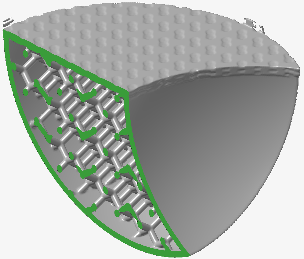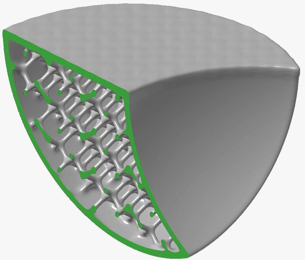 To highlight the strengths and weaknesses of the different smoothing filters, the following test model has been constructed. It comprises spherical surfaces, a planar surface, an embedded strut lattice with fine details, and a deliberately poorly designed texture on the top face, leaving noisy artifacts in the model. As a result of some of the Boolean operations, areas of high curvature (somewhat sharp edges and corners) are also present in the model. The green coloring comes from using a section plane to reveal the lattice inside the object.