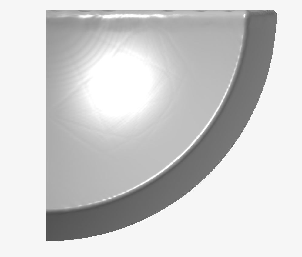 - The spherical surface is starting to exhibit straight-line patterning/texturing. This is a result of the non-linear nature of the smoothing filter. This is highlight from a different view in the second image below.
