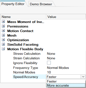 Select between Faster flexible body result types with first-order elements, or More Accurate flexible body result types with second-order elements.
