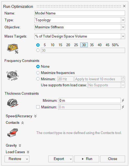 - The run Name is appended with several parameters to identify it, as well as a counter that is incremented each time you run an optimization on that particular part.