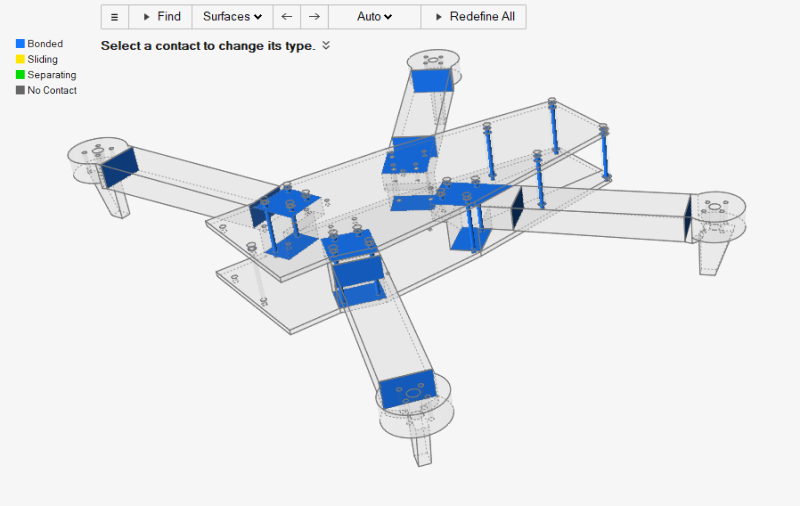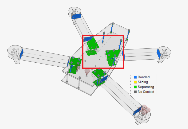 2. Note that now, locations where parts are connected using fasteners appear green, indicating that they are Contacting rather than Bonded.