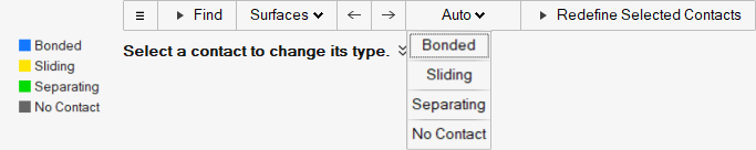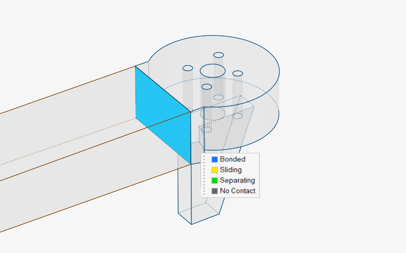Bonded contacts are shown in blue, and contacting contacts are shown in green. By default, if there are fasteners or joints connecting two neighboring parts together, they are assumed to be Contacting; otherwise, they are set to Bonded. In this example, there are no fasteners or joints present, so all of the contacts are assumed to be bonded.