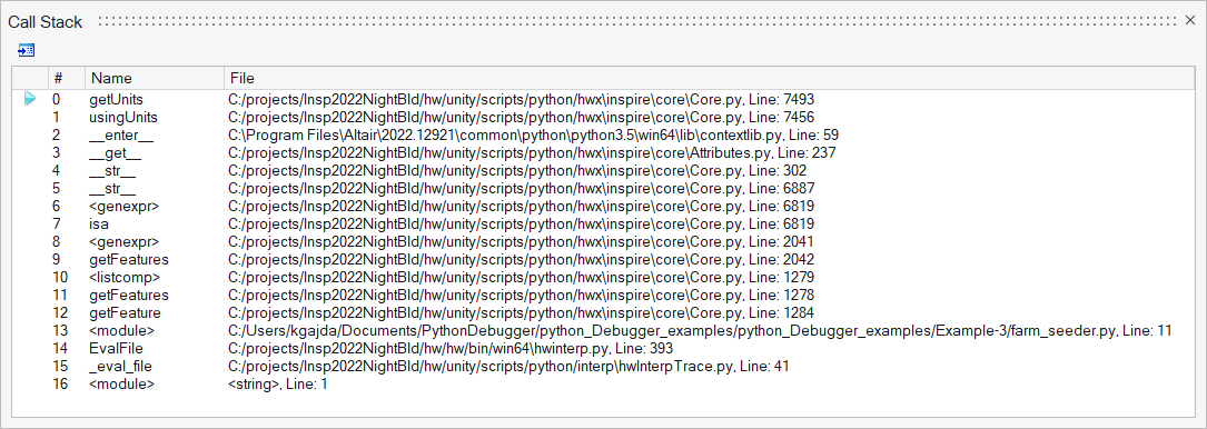 All functions that have been traversed from the main level to the current execution point are shown in the order they have been traversed, with the last function called being at the top. The item <module> refers to the top level. Double-clicking a function goes to the execution point of the call to that function.