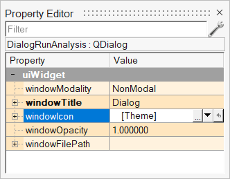 • In the Property Editor, select the [widget]Title field, and then type in the desired name. The top-level dialog can only be renamed in the Object Inspector.