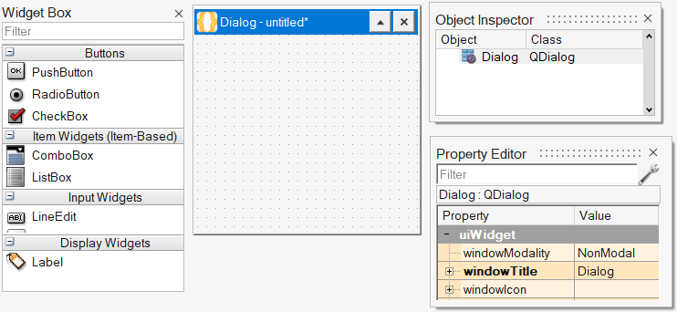 2. Drag objects from the Widget box into the Dialog to create your GUI design.
