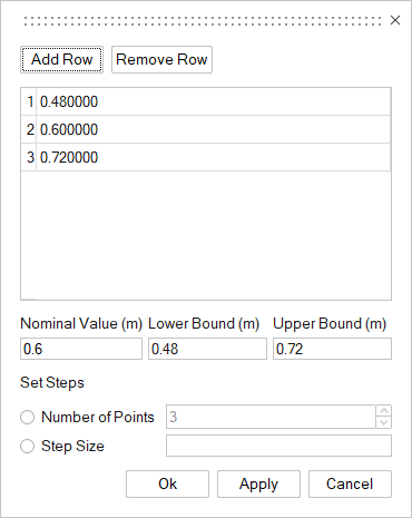 - Set Steps: Set the number of steps between the minimum and maximum values based on the Number of Points or Step Size.