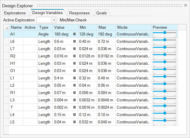 All variables in the Variable Manager are automatically added to the Design Variables manager, except if they are linked to other variables in the Variable Manager. In the Design Variables manager, you can set nominal values, the minimum and maximum values of the variable range to be studied, and the mode (continuous or discrete).