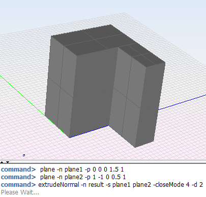 - extrudeNormal -n <name> -s <surface1> <surface2> ... -closeMode <mode> -d <distance>: Creates a object by sweeping the surfaces with names <surface1>, <surface2>, the close mode <mode> and the given distance <distance> along their corresponding normal vectors.