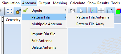 Note In order to add a pattern file antenna or pattern file array to the simulation, it is necessary to import a DIA file (radiation pattern file) before. To do that, select Antenna -> Import DIA File.