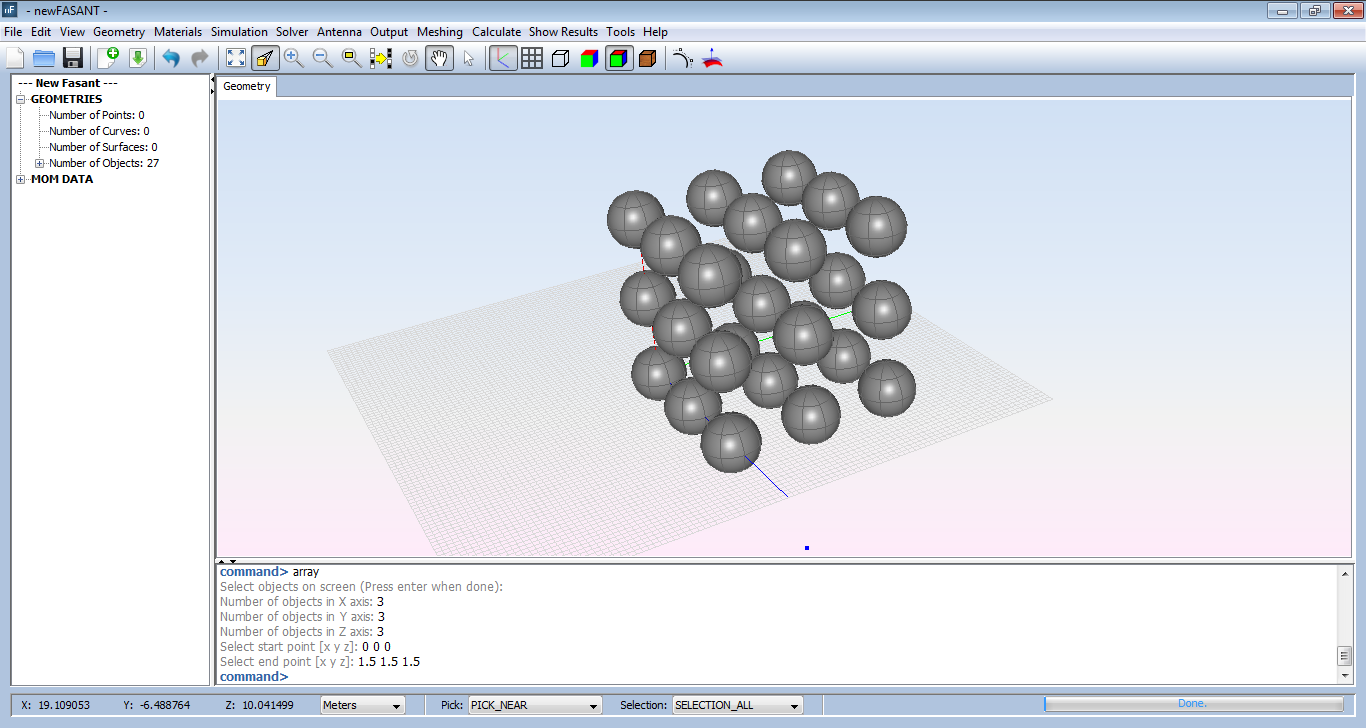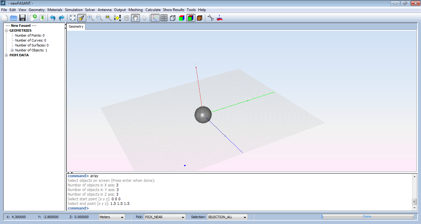 First, create any geometry (for example a sphere). To create it, click on “Geometry”, “Solids”, and click on “Sphere”. Now click on “Edit”, “Geometric Operations”, and click on “Array”.