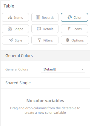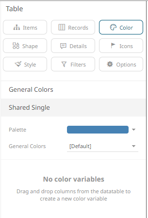 For the Table, Record Graph, Time Combination, Numeric Combination and Text Combination visualizations, instead of associating data table columns to the Color variable, you can modify the default General Colors and Shared Single settings.