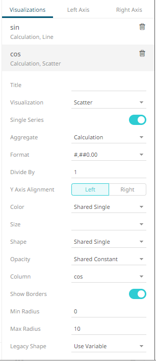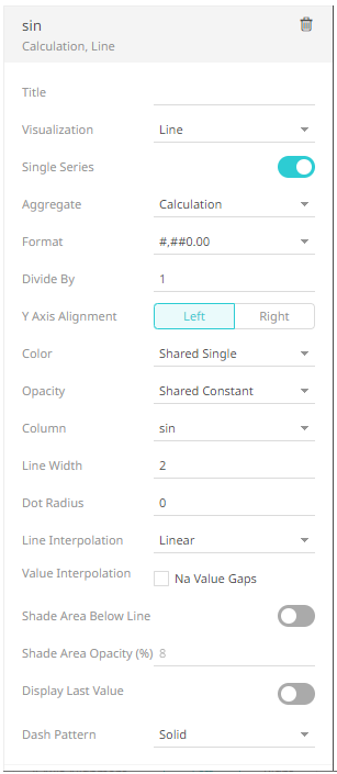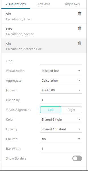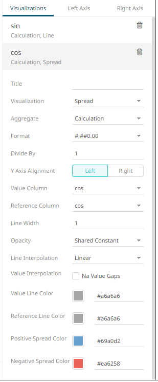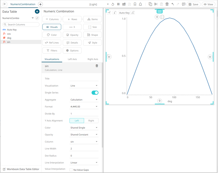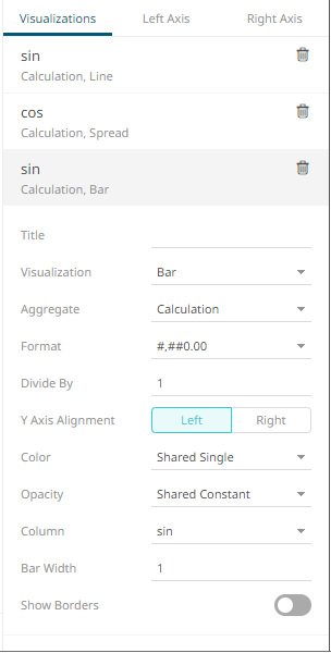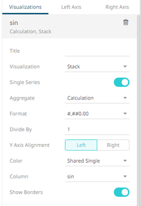 The column (e.g., sin) is added under the Visualizations tab list and, by default, uses the Line graph and the Left Y-Axis alignment.