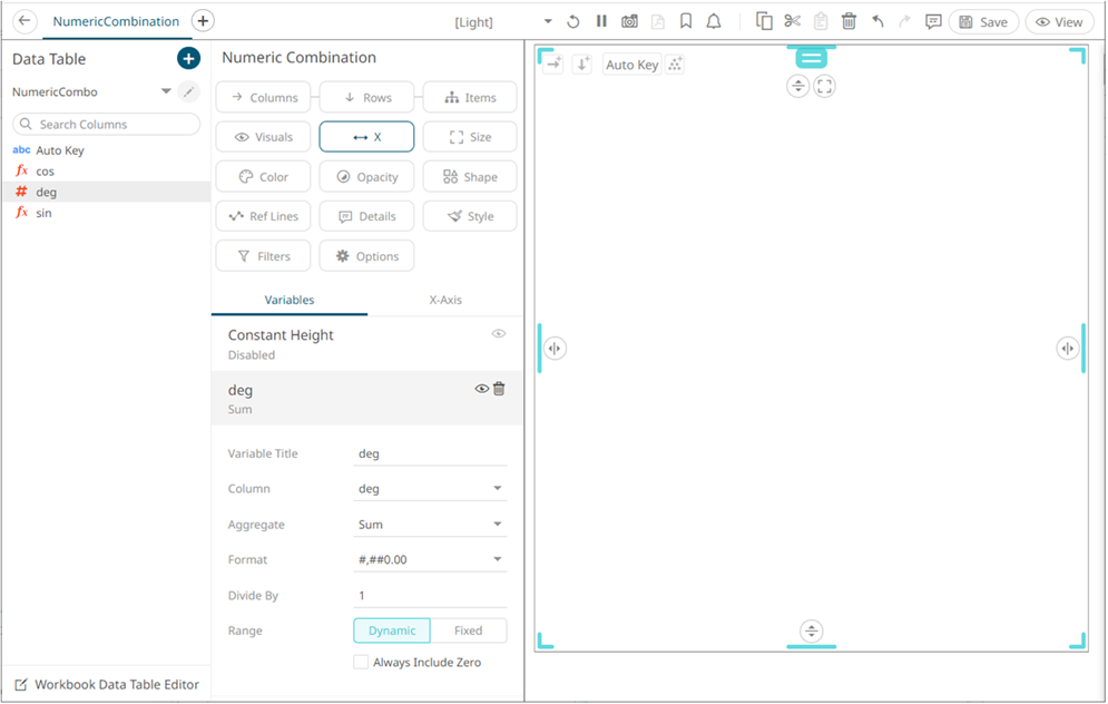 4. To set the X-axis, drag numeric columns from the Data Table pane to the X variable drop area.
