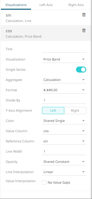 Sample 4. Single Series is enabled in the Line and Price Band graphs. In addition, in the Price Band graph, the Color is set to By Sign, the Value Column is set to the cos column, and the Reference Color to the sin column.