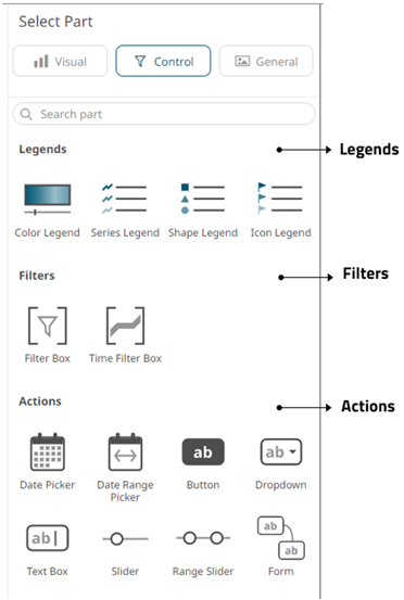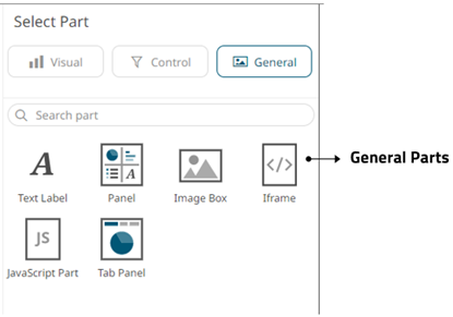 The Select Part pane has three tabs to define the settings of the dashboard visualization or part.