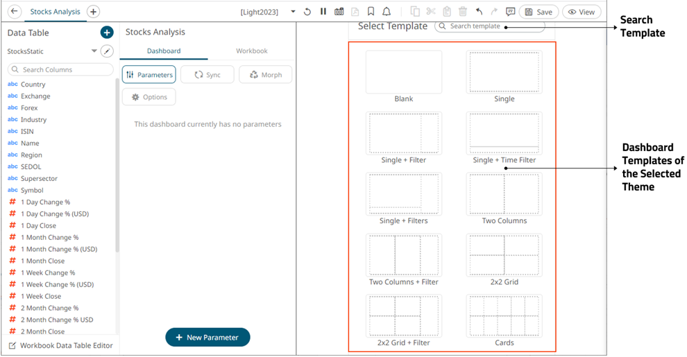 1. In the Select Template pane, click a dashboard template from the selected theme (i.e., Light2023).