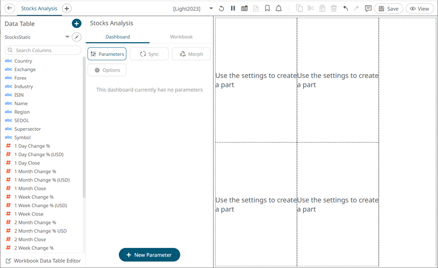 You can start your dashboard design by using the available dashboard templates of the selected workbook theme.