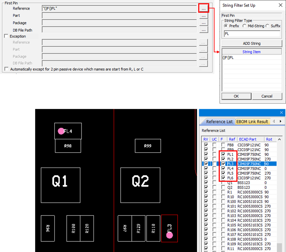 - Second Pin: Display the polarity mark by designating the part that shows the polarity at the second pin. You can set the parts to display in the string filter dialog based on the reference, part, and package names.