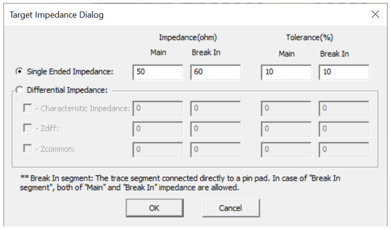 Figure 3. Break-In/Out Definition - Options: You can assign PIN/VIA Escape length and other options.