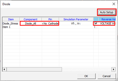 Set diode component parameters for the Transient Stress Test item.