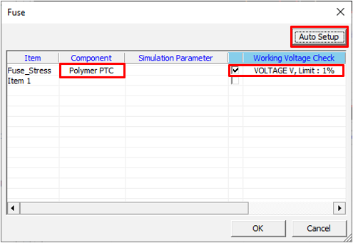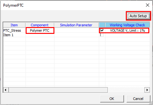 Set Polymer PTC component parameters for the Transient Stress Test item.