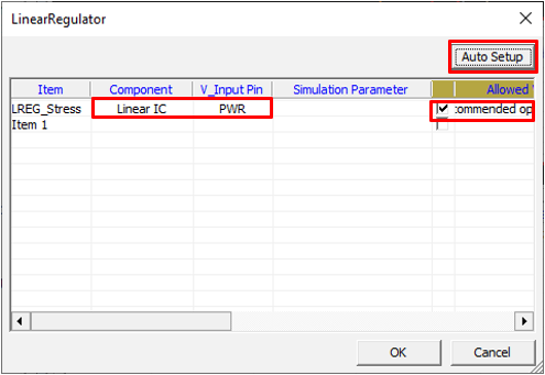 Set linear regulator component parameters for the Transient Stress Test item.