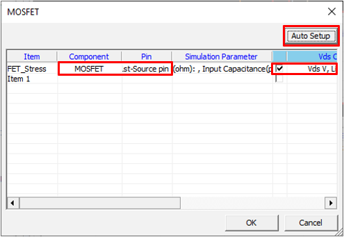 Set MOFSET component parameters for the Transient Stress Test item.