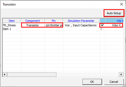 Set transistor component parameters for the Transient Stress Test item.