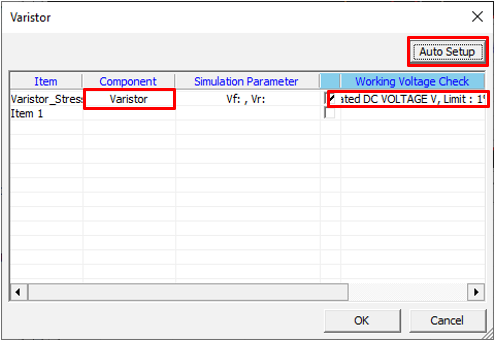 Set varistor component parameters for the Transient Stress Test item.