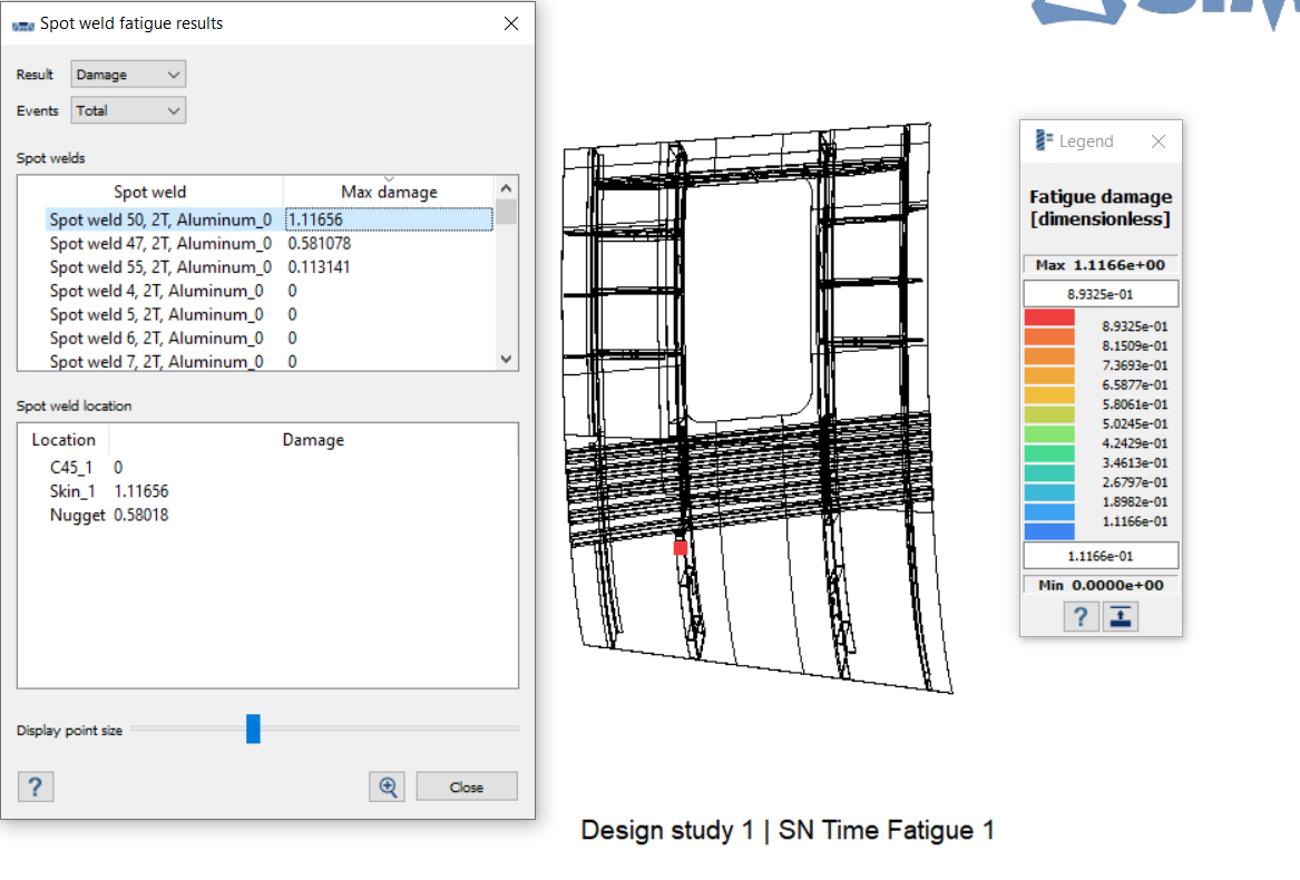 4. Select one of the spot welds to review the individual damage at the nugget and sheets.
