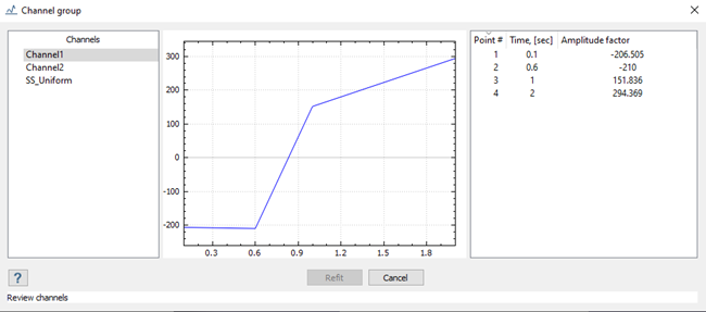 チャンネルの確認 グループにあるチャンネルを確認します。 確認するチャンネル荷重をProject Treeでクリックします。 インポートしたチャンネルファイルから利用可能なすべてのチャンネルと、その場で作成した統一チャンネルが、 Channel groupダイアログに一覧表示されます。 図 1. マウスのスクロールボタンを使用すると、カーブの表示を拡大縮小できます。 カーブをフィットし直すにはRefitをクリックします。 振幅列または時間列の表見出しをクリックすると、その列のデータを昇順または降順で並べ替えることができます。