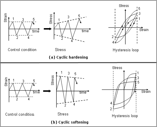 材料の繰り返し応答(a)のように、一定範囲のひずみの下で、前のサイクルよりも応力振幅が大きくなる状態を繰り返し硬化と呼び、応力振幅が小さくなる状態を繰り返し軟化(b)と呼びます。