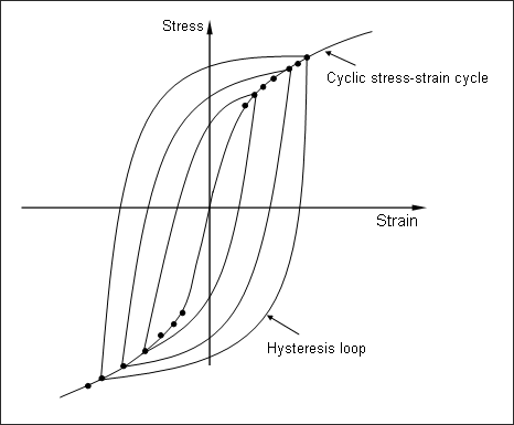 図 2のように1つの座標系にこれらのヒステリシスループを配置すると、ループのすべての頂点を結ぶラインによって繰り返し応力ひずみ曲線が得られます。