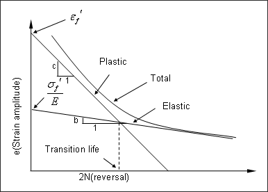 は弾性ひずみ振幅です。したがって、弾性ひずみと塑性ひずみの和である総ひずみ振幅は、Basquinによる式およびCoffinとMansonによる式を適用して次のように記述できます。
